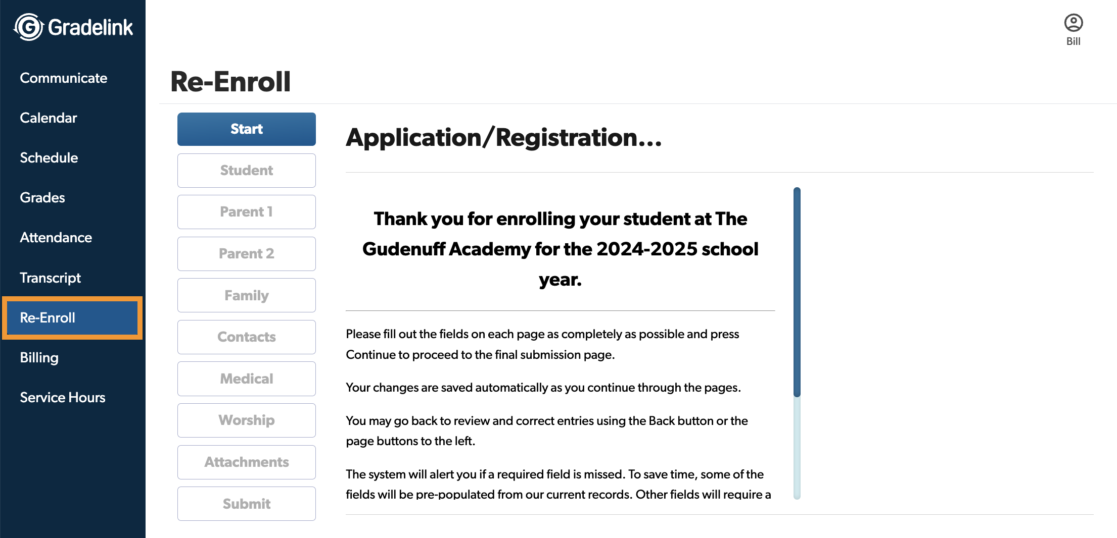 Existing families will see the Re-Enroll tab on the left sidebar in their Parent Portal when they log in. From there, they can begin the process of re-enrolling their student.